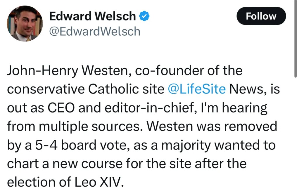 Okazuje się, że jest nim sam John-Henry Weston. Nawet tak spolegliwa krytyka Leona XIV doprowadziła do jego zwolnienia, ponieważ media katolickie nastawiają się na długi okres koegzystencji z obecnym okupantem Stolicy Piotrowej, który – naszym zdaniem – papieżem nie jest.