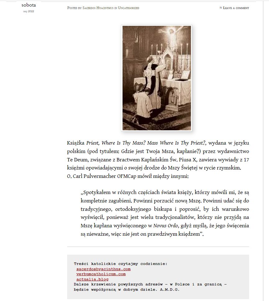 W sumie to tylko tyle. W pozostałych przypadkach, stosując analogię z małżeństwem, które cieszy się przychylnością prawa, należy domniemywać ważności święceń i dać sobie spokój z dalszym dociekaniem. Piszący te słowa swego czasu czytał internetowe fora na temat ważności lub nieważności święceń, gdzie ludzie, wychodząc od fałszywej przesłanki wpadają w absurdy, będąc przy okazji odpornymi na wszelkie uwagi lub krytykę. Po prostu jakoś chcą, by tak było i chcą się męczyć. W przypadku świeckiego, który akurat chce jeździć do tej, a nie innej kaplicy sedewakantystów jest to zrozumiałe, w przypadku księdza autodestrukcyjne. Zwykle pada w tym kontekście argument zmiany formuły święceń biskupów po Vat. II.
